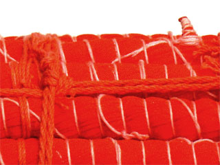 生地が絞られ、表部分が染められた状態(染料の色は赤)