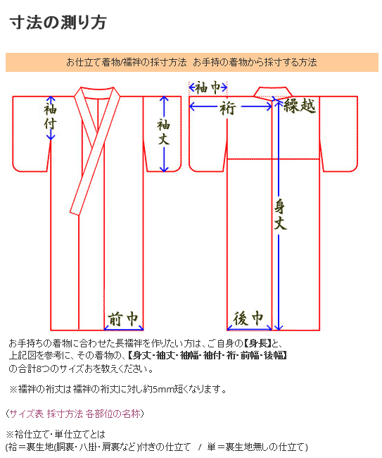 サイズ表 (着物) / サイズ表 (羽織)採寸方法お仕立て・御誂え・測り方紋入れ加工について
