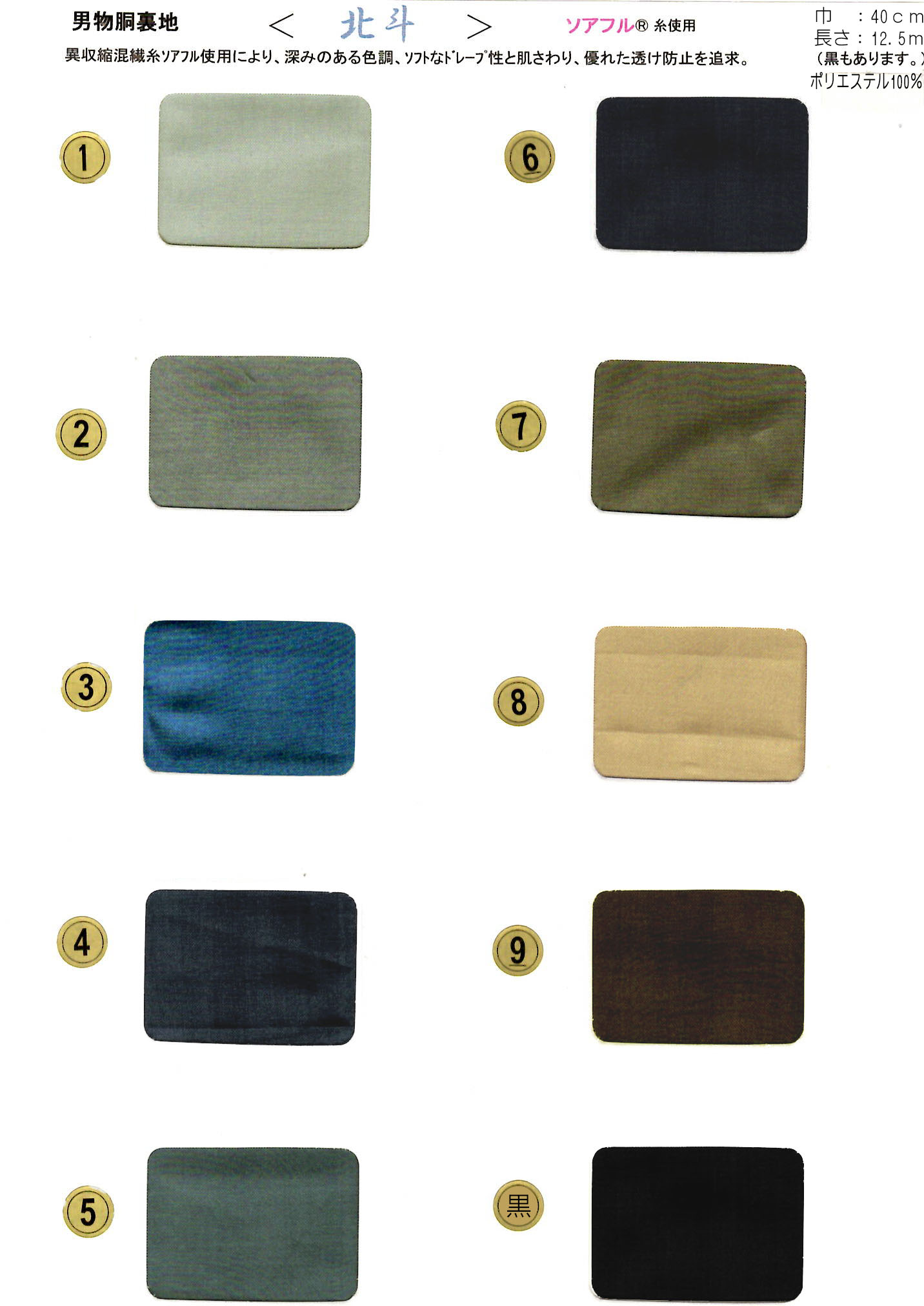 "Hokuto" No. 2 (Gray) is a highly dependable color often favored by professional tailors for its incredible versatility. It provides a modest and classy impression when the kimono is removed, allowing the beauty of the outer garment to shine. We highly recommend this for anyone seeking a high-quality polyester lining.