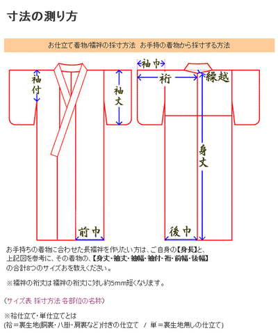 If you would like to have a kimono, haori, and nagajuban made to match a kimono you already own, please let us know your height and the measurements of the kimono using the chart above as a reference.