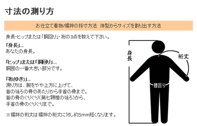 If you would like to have a kimono, haori, and nagajuban made to match a kimono you already own, please let us know your height and the measurements of the kimono using the chart above as a reference.